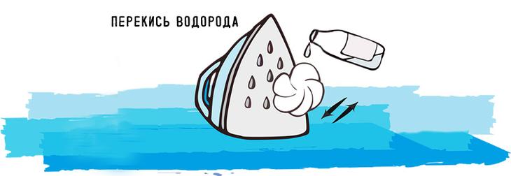 В домашних условиях очистить утюг можно перекисью водорода. Смочите ватный диск в 3%-ном растворе, потом ототрите имеющиеся пятна на холодной подошве. Перекись способна растворять частицы налета и облегчает процесс их удаления.