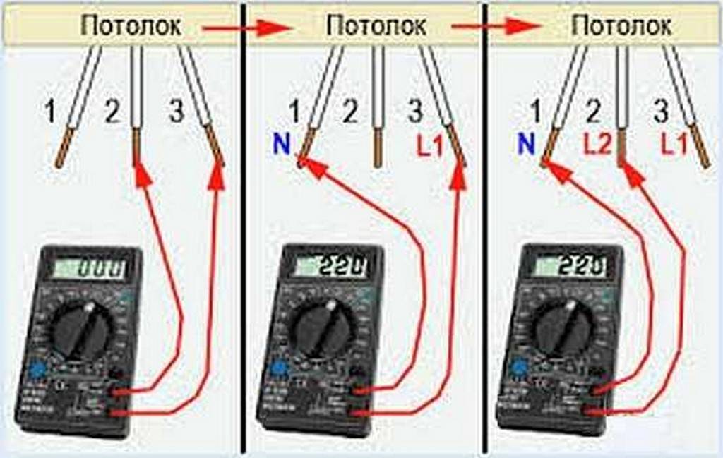 Чтобы определиться, где какой провод, можно воспользоваться либо мультиметром, либо индикаторной отверткой, с помощью которой легко определить фазный проводник. Если на потолке 3 провода, и они коммутируются двумя выключателями, то должно быть 2 фазных провода и один нулевой. Выключатели следует включать/выключать поочередно, чтобы определить, какой фазный проводник связан с определенной клавишей выключателя. После того, как назначение всех проводов определено, можно приступать к подключению люстры, выключив перед этим автомат на осветительном щитке для надежности, хотя достаточно перевести клавиши выключателей в положение «выключено» и проконтролировать наличие напряжения на фазных проводах с помощью индикаторной отвертки. Как правило, выключателями коммутируются фазные проводники, как более опасные.