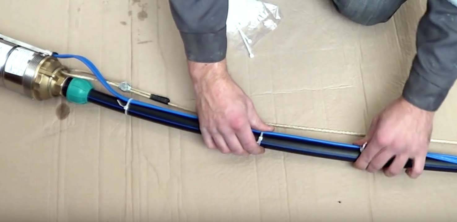 Производится крепеж скважинного насоса к страховочному тросу. Диаметр троса подбирается исходя из глубины скважины. Чем она больше, тем большая масса конструкции водопровода, но уже с водой в трубе тянуть вниз