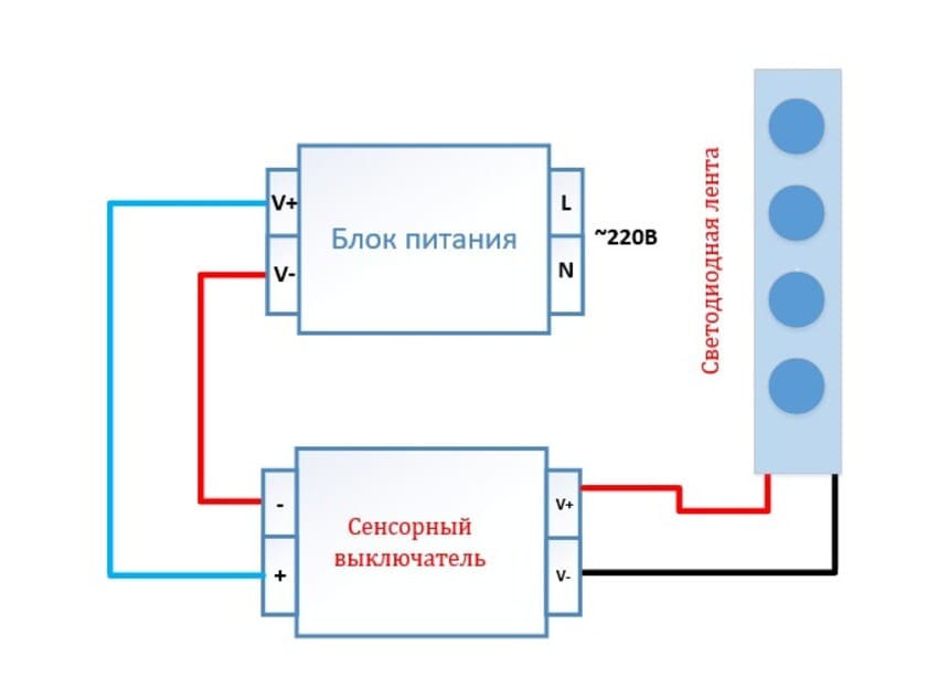 По схеме, подключение сенсорного выключателя к светодиодной ленте производится между блоком питания и источником света. Контакты выключателя, обозначенные как LED+ и LED- предназначены для подключения к ленте. Это выход выключателя. А контакты VCC(+) и GND(-) – питающие, на них подключается питание с БП. Обозначение контактов может изменяться, в зависимости от модели, но контакты с маркировкой “LED” подключаются к светодиодному источнику света. Противоположные подключаются к блоку питания.