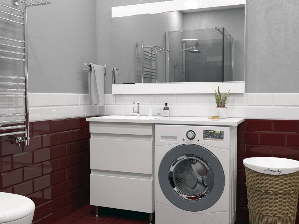 - В ванной комнате. Удобство в этом случае обусловлено тем, что все коммуникации располагаются в непосредственной близости. Внешний вид изделия гармонично вписывается в пространство. Если планируется ремонт в этой комнате с полным переоборудованием сантехизделий, то можно разместить стиральную машинку под раковиной подходящей конструкции с оборудованным сливом по задней плоскости.