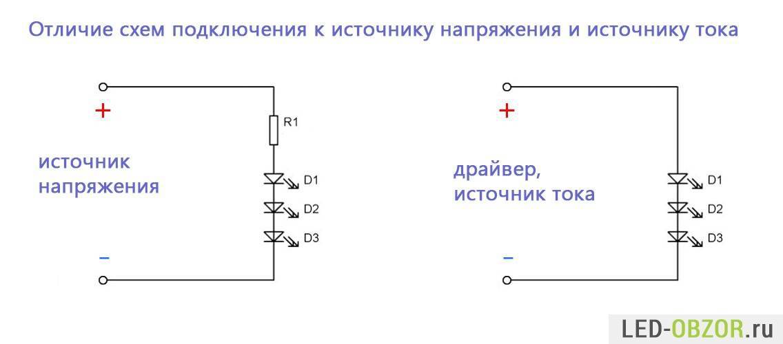 Прямой номинальный ток – главный параметр любого светодиода. Занижая его, мы теряем в яркости, а завышая – резко сокращаем срок службы. Поэтому лучшим источником питания является светодиодный драйвер, при подключении к которому через светодиод всегда будет протекать постоянный ток нужной величины.