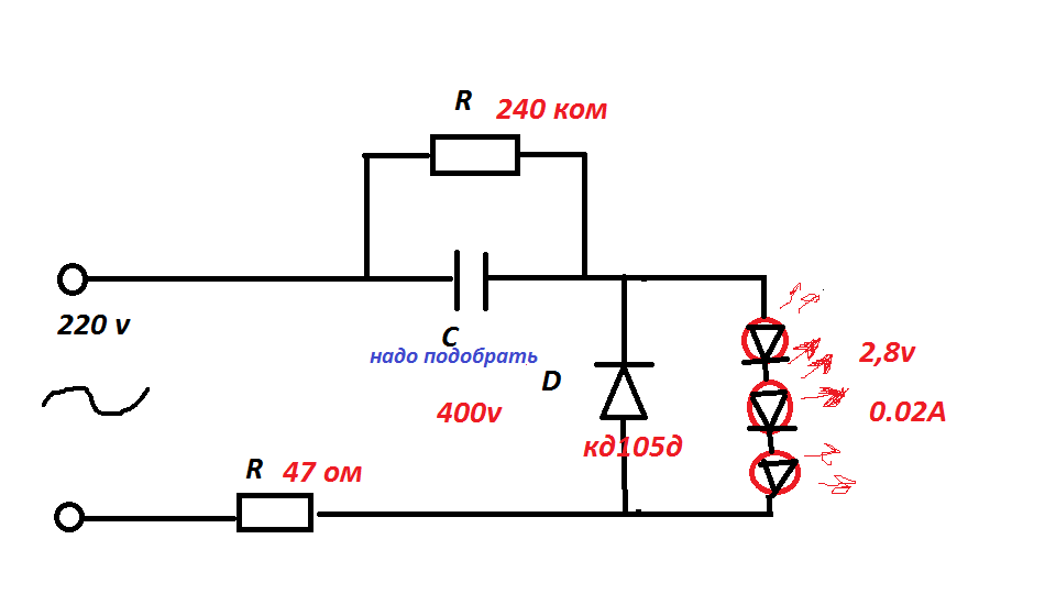 С мкФ – ёмкость конде-ра. Он должен быть рассчитан на 400-500В; Iсд – номинальный ток диода (смотрим в паспортных данных); Uвх – амплитудное напряжение сети — 320В; Uвых – номинальное напряжение питания LED.
