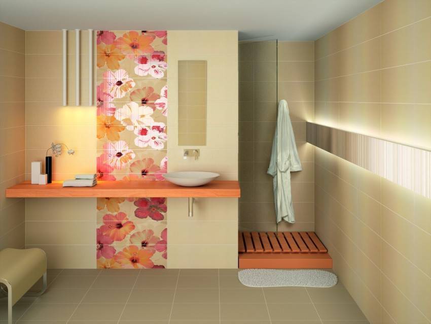 С образцами яркой палитры ситуация обратная. Их разбавляют нейтральными оттенками. Используются они для зонирования площади: раковины, кухонного фартука, туалета.