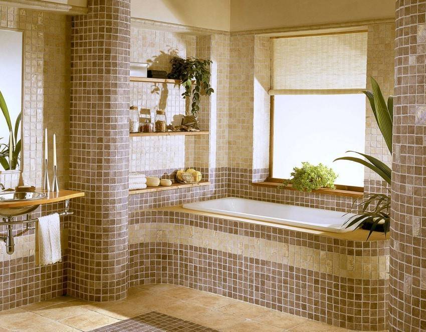 Мелкий рисунок меняет зрительное восприятие пространства, поэтому мозаику рекомендуют для небольших помещений. Квадраты величиной не более 2 см крепятся на гибком сетчатом основании. Элементы мозаики делаются из керамики, натурального камня, стекла, зеркального полотна. Чем мельче мозаика, тем сложнее получается узор.