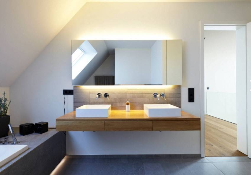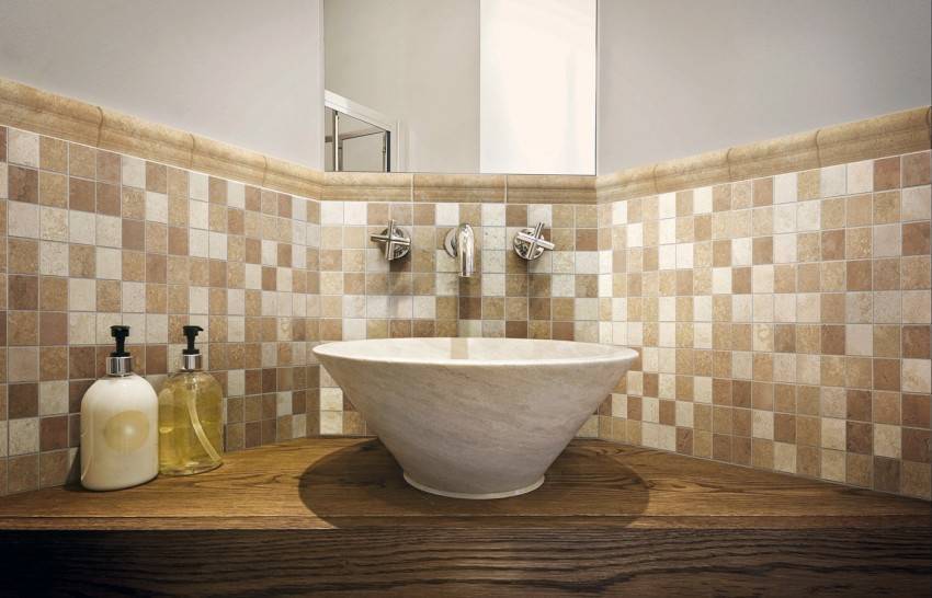 В стену, облицованную плиткой, можно вмонтировать зеркало, споты, декоративное панно. На фото ниже примеры комбинации керамики с зеркальным полотном.