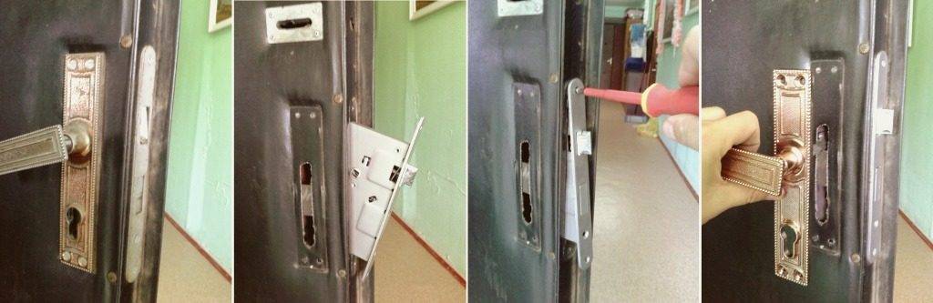 Для выполнения ремонта снимать замок не обязательно. Все можно сделать непосредственно на дверном полотне.