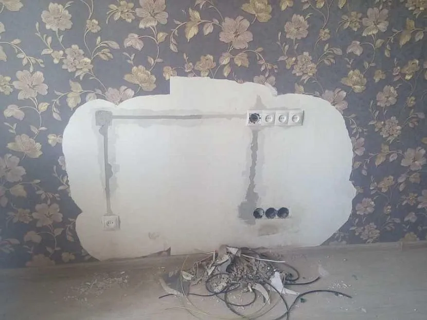 - В отверстии стены должно остаться 2 кабеля. Если они оголены, то необходимо обмотать их изолентой.