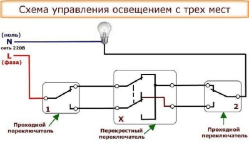 При любом положении клавиши перекрестного выключателя схема обеспечивает управление освещением с двух крайних преключателей.