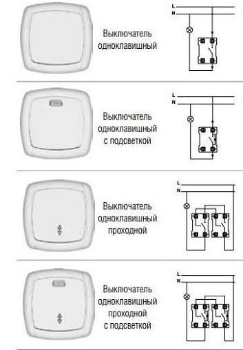 Далее рассмотрим подробно схемы подключения разных видов выключателей.