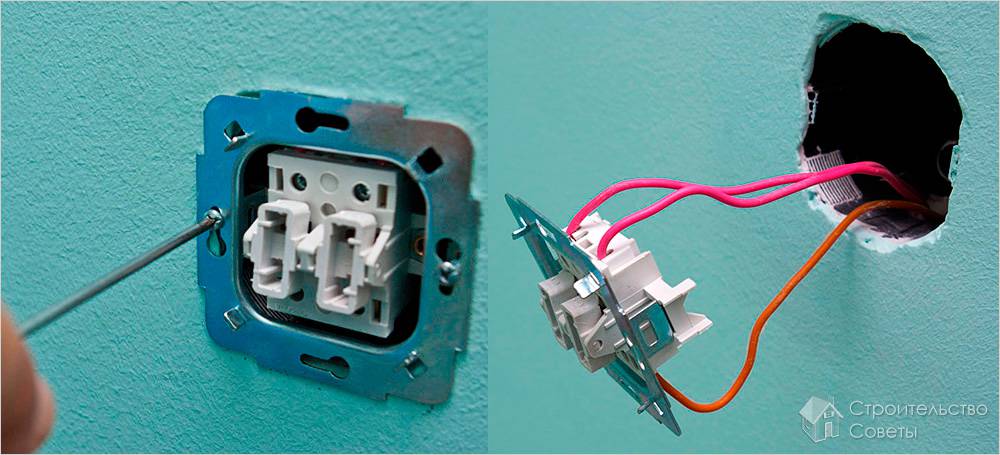 - Установить 2-клавишный выключатель на место старого, зафиксировав его раздвижными лапками.