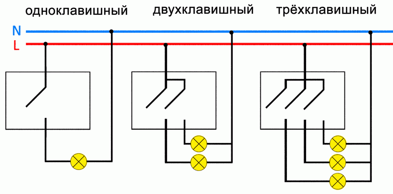 Выключатель может быть одноклавишным и управлять одним светильником. Если он двухклавишный, то возможны два варианта: либо к изделию подключено два световых прибора, установленных в разных помещениях (туалет, ванная), либо в многоламповом светильнике раздельно управляются две группы ламп, например люстра. Также существуют более сложные трехклавишные выключатели и комбинированные блоки выключателя с розеткой.