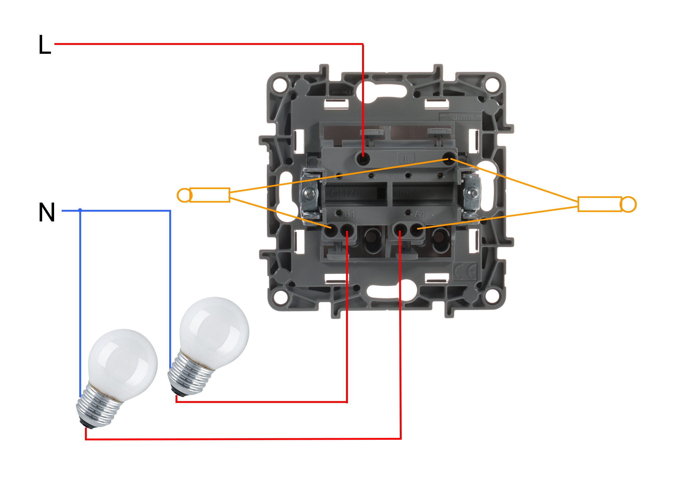 Подключение на примере двухклавишного выключателя