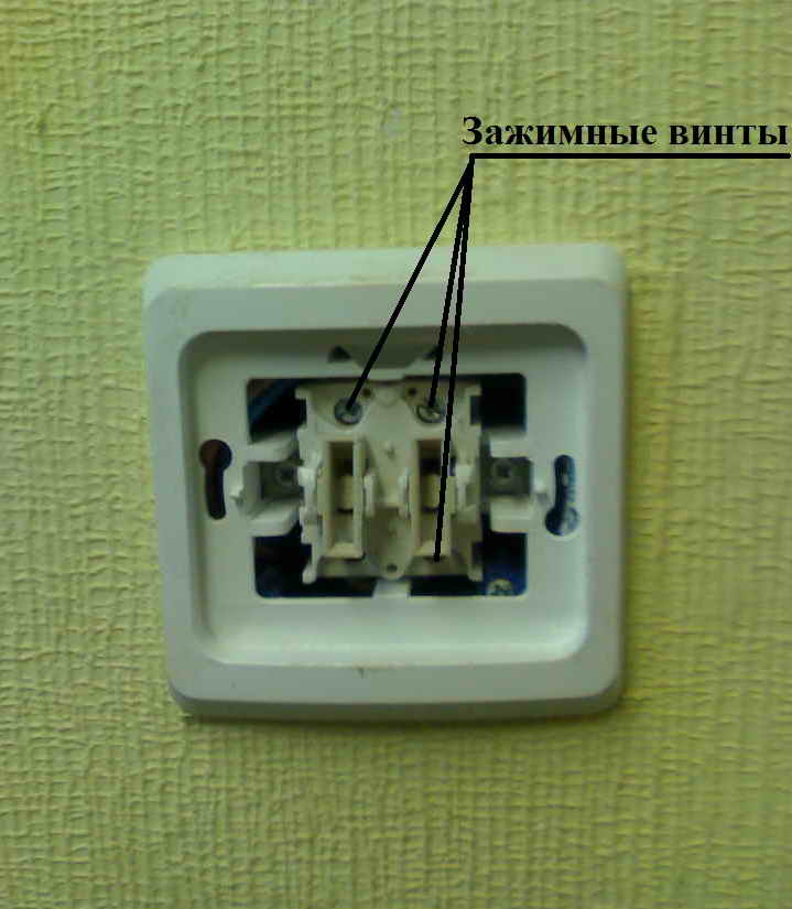 - Демонтировать одноклавишный выключатель, отсоединив провода и ослабив винты распорных лапок.