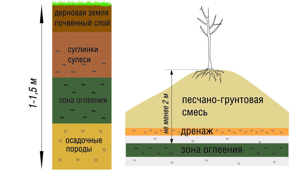 Если в разрезе присутствуют глины синевато-черного цвета (они могут иметь затхлый запах), то это и есть оглеенная почва. Измерьте глубину залегания этого слоя. При посадке деревьев холмы нужно делать так, чтобы от места посадки до глеевого слоя было не менее 2 м, с учетом усадки почвы. Усадка происходит на 10% от высоты рыхлого грунта. Для холмика почву делайте с добавлением песка, чтобы улучшить ее аэрацию.