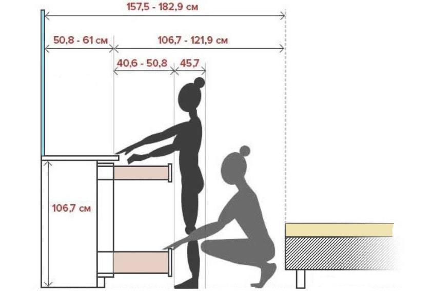 - Итоговая формула расчета = глубина комода + глубина ящика + 90 см.