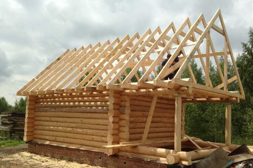 Делается гидроизоляция рубероидом, с укладкой мха поверх бревен, толщиной до 3 см. Дерево не должно прощупываться подо мхом. На веранде мох не нужен, здесь не так нужна равномерность. После этого начинается изготовление стропил из досок 50х150 мм. Стропила покрывают пароизоляцией и контробрешеткой из реек 20х50 мм.