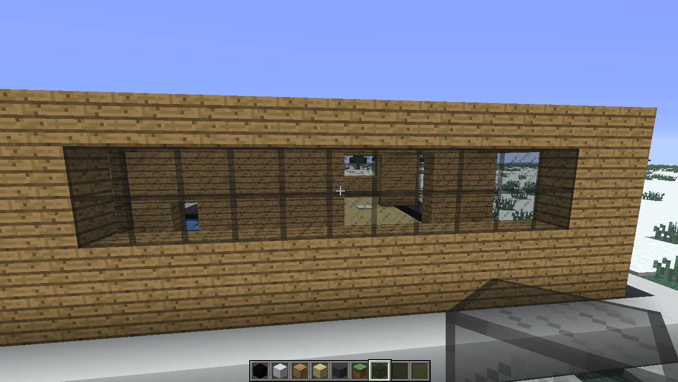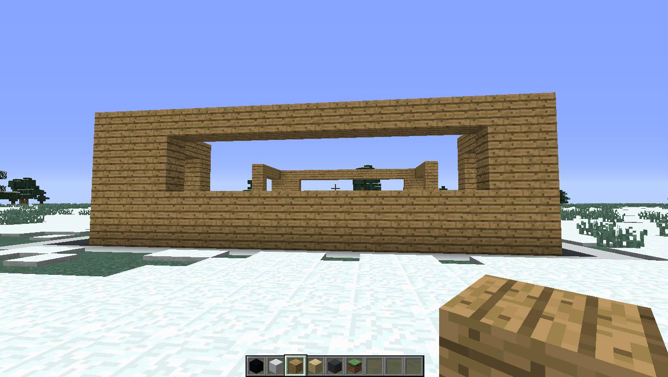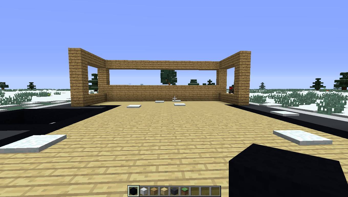 - Потом сделайте окна размером 6 блоков в длину и 5 блоков в высоту. После этого соедините их так же, как на скриншоте. Также по бокам нарастите блоки. Со стороны, где бассейн, нарастите на два блока, а с противоположной стороны на один.