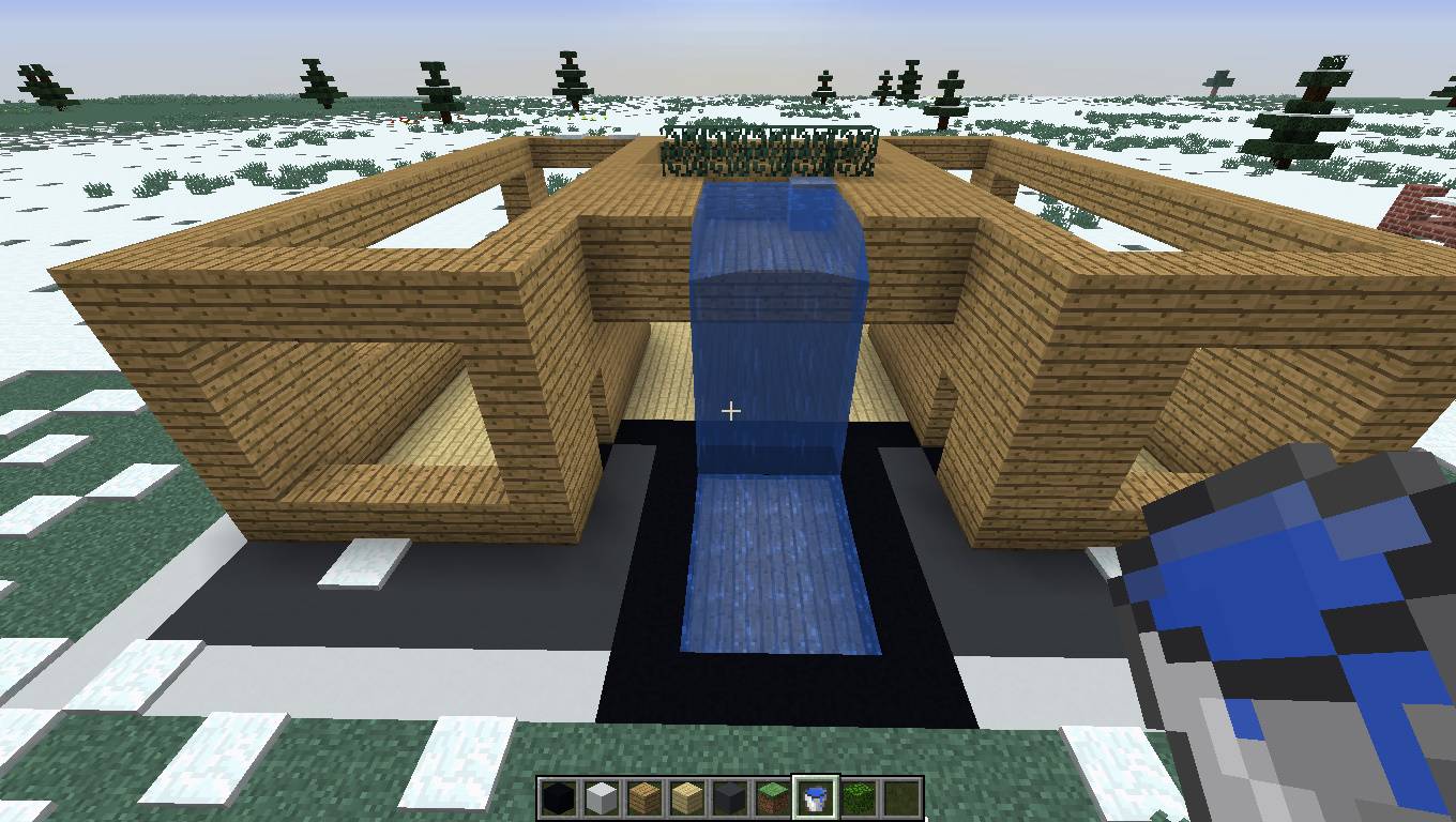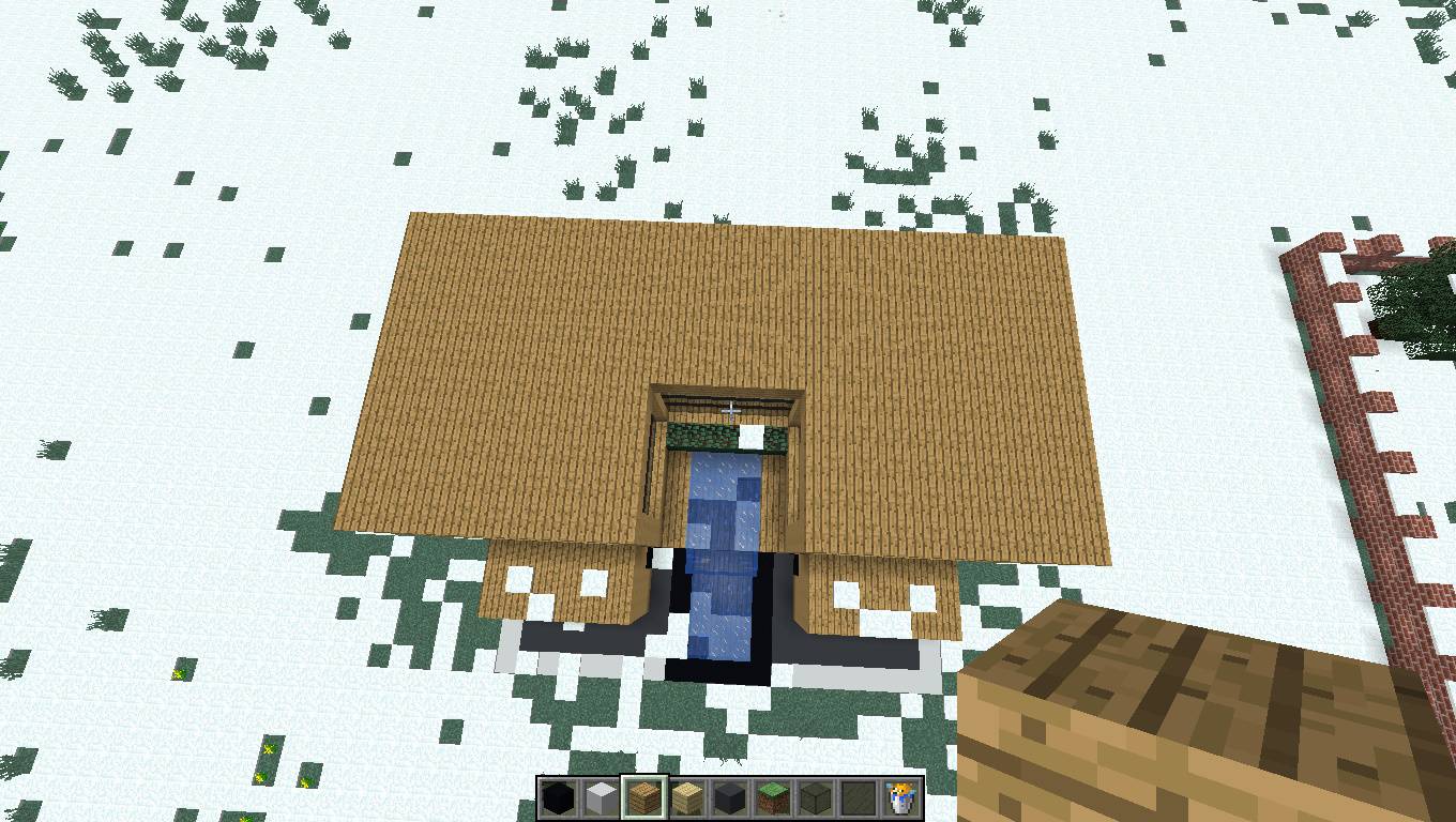 - Потом сделайте на верху, около водопада, линию из дубовых досок длиной 9 блоков, так, чтобы два заходили дальше стены. Потом сделайте такую конструкцию. Колонны делайте высотой пять блоков (не считая линию конструкции).