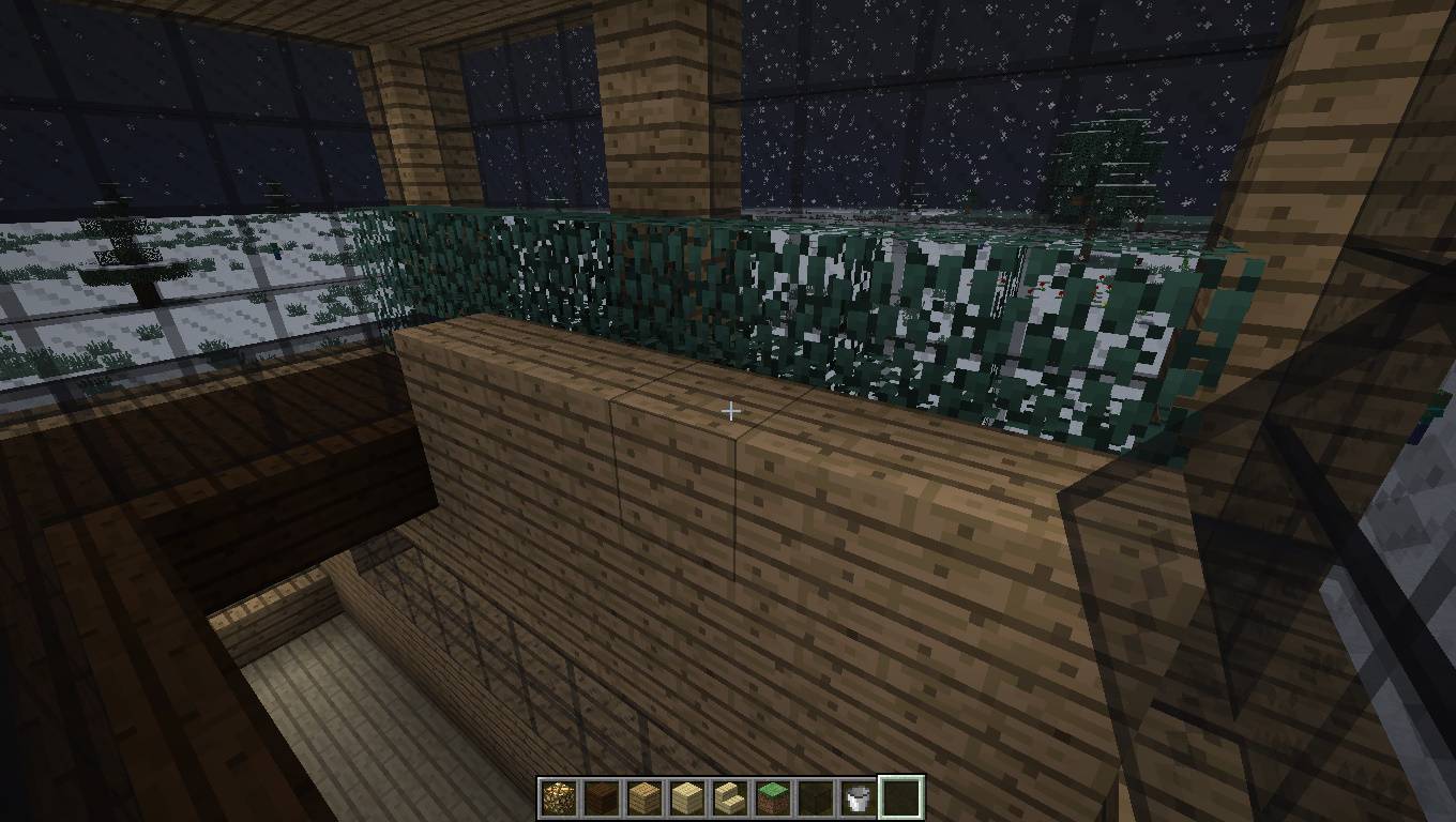 - Далее в конце комнаты (справа относительно фронтальной стороны) во всю ширину сделайте «живую изгородь» из листьев дуба, высотой два блока. Потом сделайте линию из 6 дубовых досок. Внизу сделайте лестницу шириной два блока. После этого сделайте перила из стеклянных панелей так, чтобы в конце оставался проем в один блок.