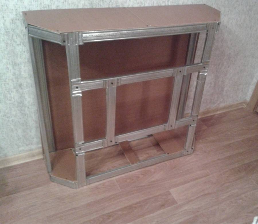 Когда весь каркас будет готов, можно приступать к облицовке его гипсокартонном. После этого каждый образовавшийся стык замазывается специальной шпатлевкой