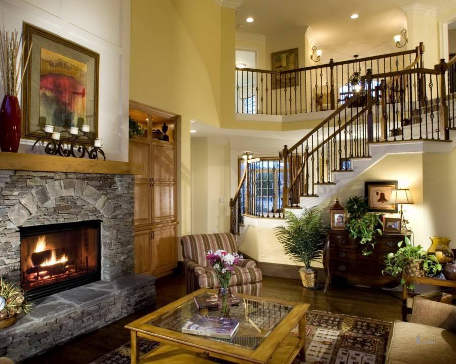 Камины для интерьера в деревенском стиле (фото на рис. 3) можно оклеить легкой плиткой, воспроизводящей поверхность скальных пород. Перед отделкой поверхность ГКЛ покрыть шпатлевкой для лучшей адгезии плиточного клея. Монтаж плитки производят по общим правилам: