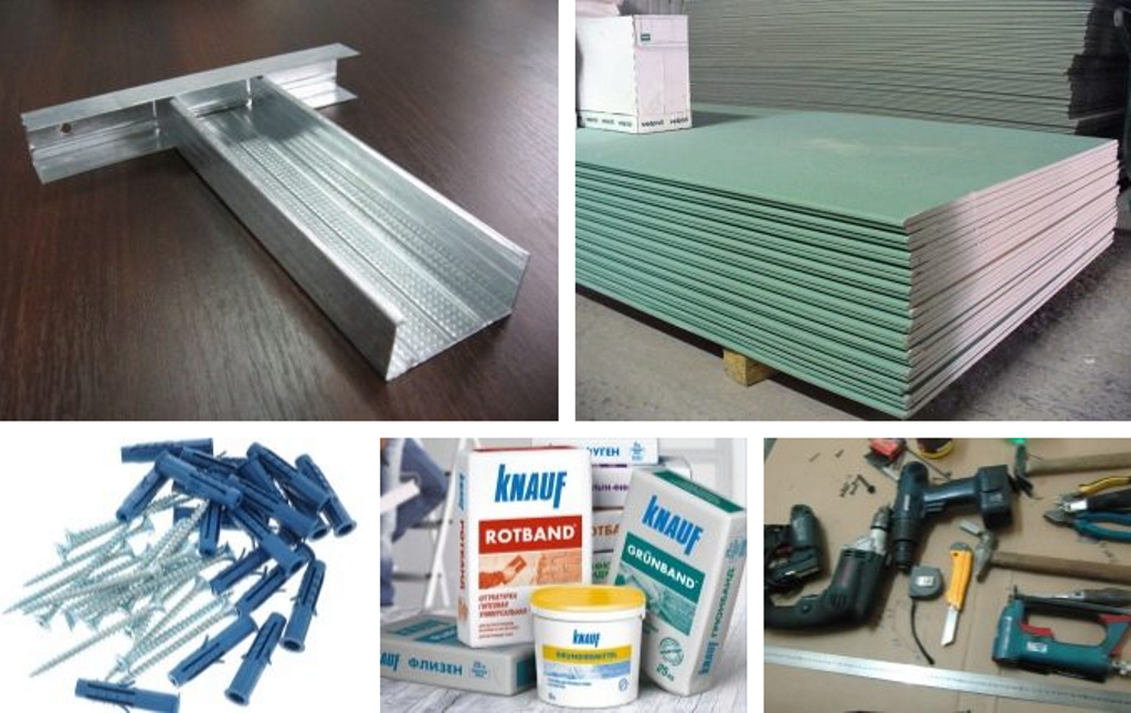 Для работы понадобится лист гипсокартона достаточного размера, бруски или перфорированные профили, уголки для сборки каркаса, шуруповерт, перфоратор, достаточное количество саморезов, строительный уровень, металлическая рулетка, карандаш, линейка, угольник, электролобзик или нож для нарезки материала. Для черновой и финишной отделки пригодится наждачная бумага, шпаклевка, краска или бумага для оклеивания.