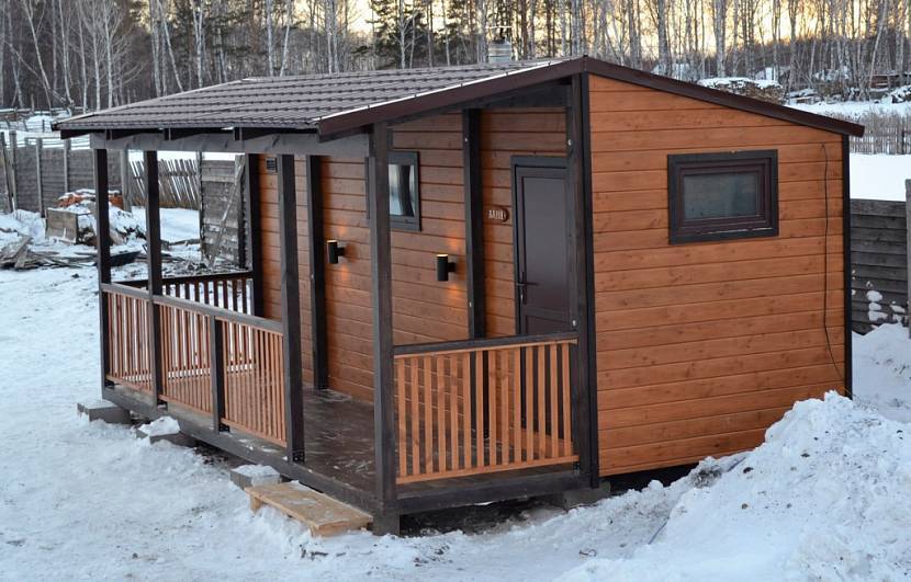 Каркасная баня может быть оборудована террасой для посиделок в теплое время года