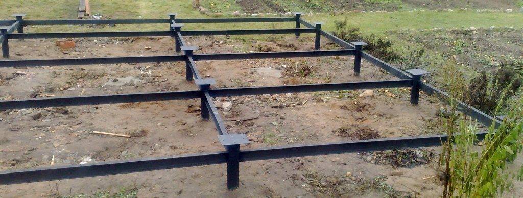 Сооружается металлический каркас. Понадобится брус, размерами 100 на 150 мм, из которого изготавливают опорные стойки. Они устанавливаются по углам в полу. Лаги расставляются по периметру и фиксируются. К ним монтируются поперечные и продольные лаги. Все брусья соединяются в местах выпалов с помощью саморезов. Стоит дополнительно проверять каждый элемент, чтобы конструкция получилась прочной.