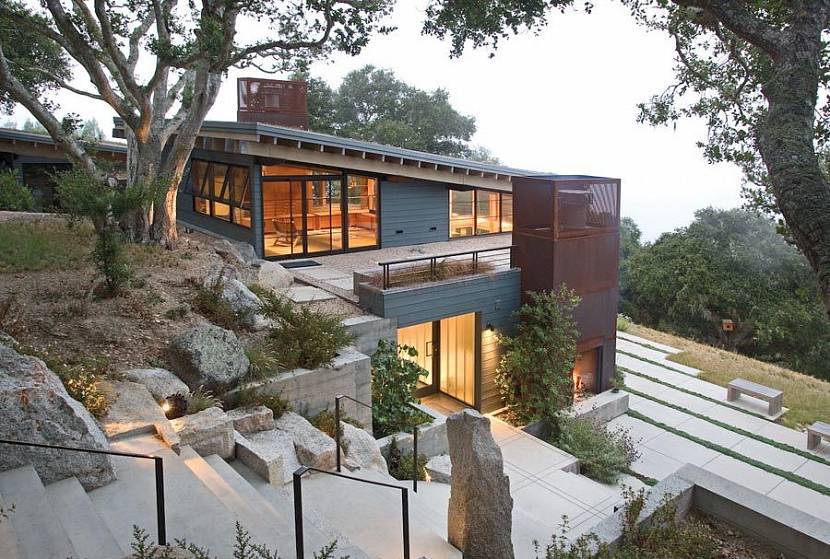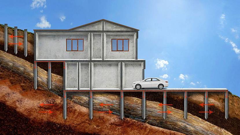 При проектировании дома на склоне используются приемы, повышающие надежность и комфорт проживания: