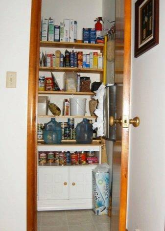 При обустройстве кладовой часто используют дополнительные навесные полки, тумбы, комоды и прочее. Определяясь с планировкой комнаты, учитывайте ее основное предназначение. Если подсобка будет преимущественно использоваться для хранения консервации, то необходимо предусмотреть максимальное количество широких полок с усилением, выдерживающим требуемую нагрузку. Для легких вещей или книг можно сделать аналог с остеклением. Предварительно дерево, используемое для изготовления стеллажа в кладовку, следует обработать специальными составами, предупреждающими гниение и образование грибка.