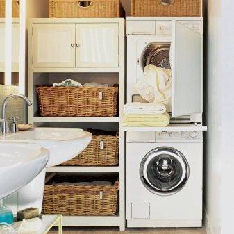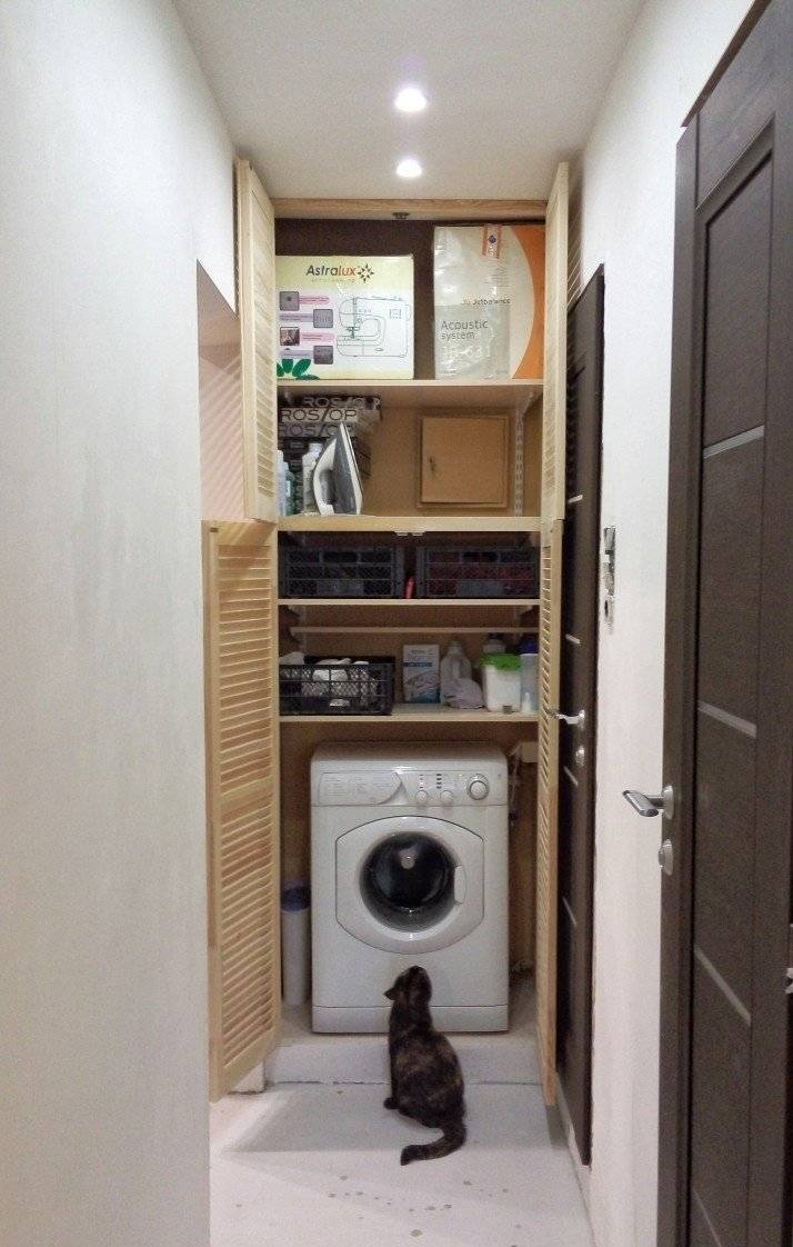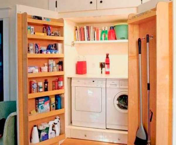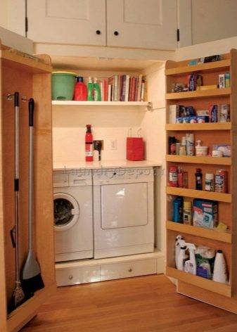 Если кладовка находится рядом с ванной или кухней, то можно организовать даже прачечную. Здесь также найдется место не только для стиральной машины, но и для полочек с порошками и кондиционерами, для корзины с одеждой и небольшой сушилки. Такой способ позволит значительно сэкономить место на кухне и в ванной комнате. А для большей функциональности можно предусмотреть и прикрепить откидную гладильную доску на двери кладовки.