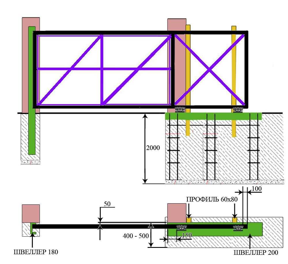 Сначала залили фундамент. В него установили арматуру, сверху швеллер спинкой вверх. Вплотную к швеллеру две стойки из профилированной трубы 80*60 мм. Одна стойка примыкает к столбу, вторая выставлена вертикально на расстоянии 120 см. На них потом навешиваются ролики, которые придерживают полотно сверху. С другой стороны, вдоль ответного столба установили швеллер 180 мм.