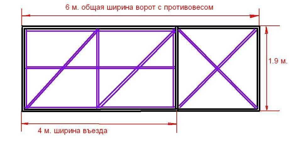 Первым делом сварили каркас для ворот с противовесом. Раму (черным цветом) делали из профильной трубы 60*40 мм, перемычки и внутренний каркас (сиреневый) из трубы 40*20 мм. Внизу приварена направляющая балка разрезом вниз.