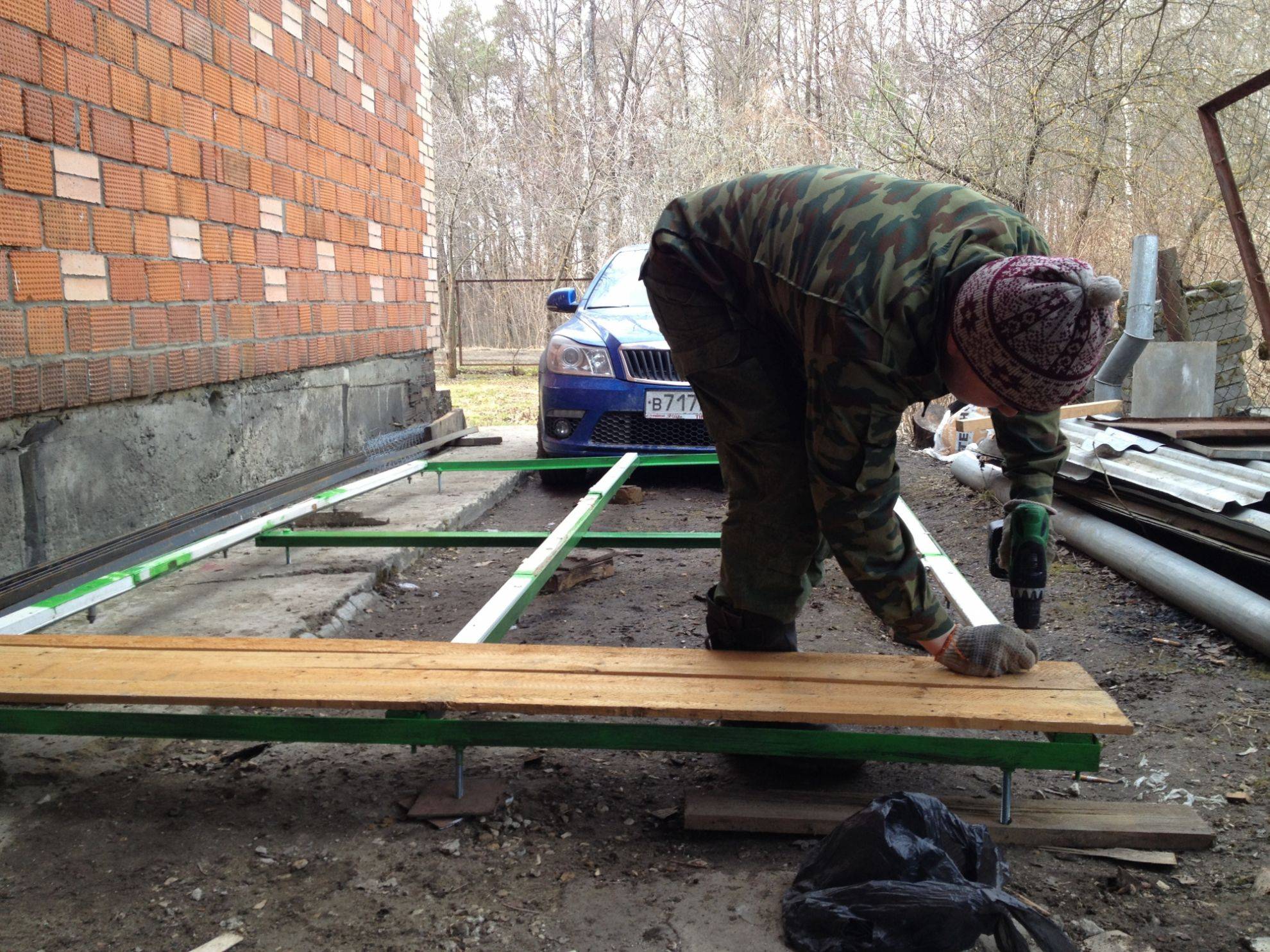 Можно сделать деревянный настил в виде щитовой конструкции. В таком случае вначале нужно собрать металлическую раму из профилированной трубы. Затем обшить ее досками толщиной не менее 40 мм.