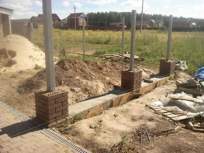 Простота сооружения забора из профнастила своими руками не всегда является таковой, особенно, если в качестве опорных стоек выбирается кирпич. Такие столбы уже сами по себе являются тяжелыми сооружениями, поэтому под них обязательно заливается фундамент. А так как тяжелый столб имеет свойства заваливаться, то под заборную конструкцию заливают ленточный фундамент по всему периметру ограждаемого участка.