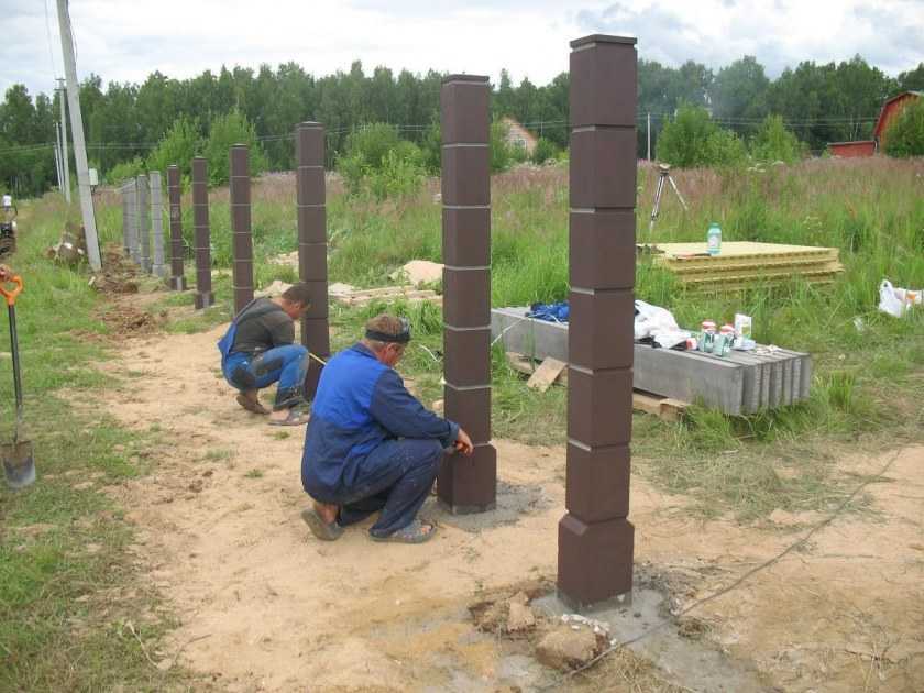 - Монтаж опорных деревянных, металлических, бетонных или кирпичных столбов с заглублением в соответствии с уровнем промерзания грунта. Можно использовать установку столбов посредством забивки в грунт, копки или бурения ям, забутовки или полноценного бетонирования.