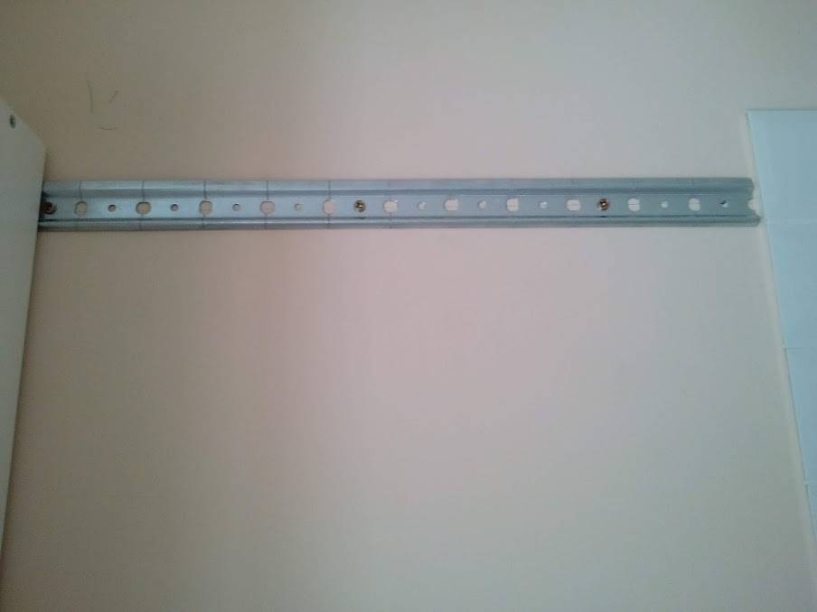 | Рис. 30. Слева уже навешен один шкаф на стену, на остаток шины будет повешен следующий шкаф |
