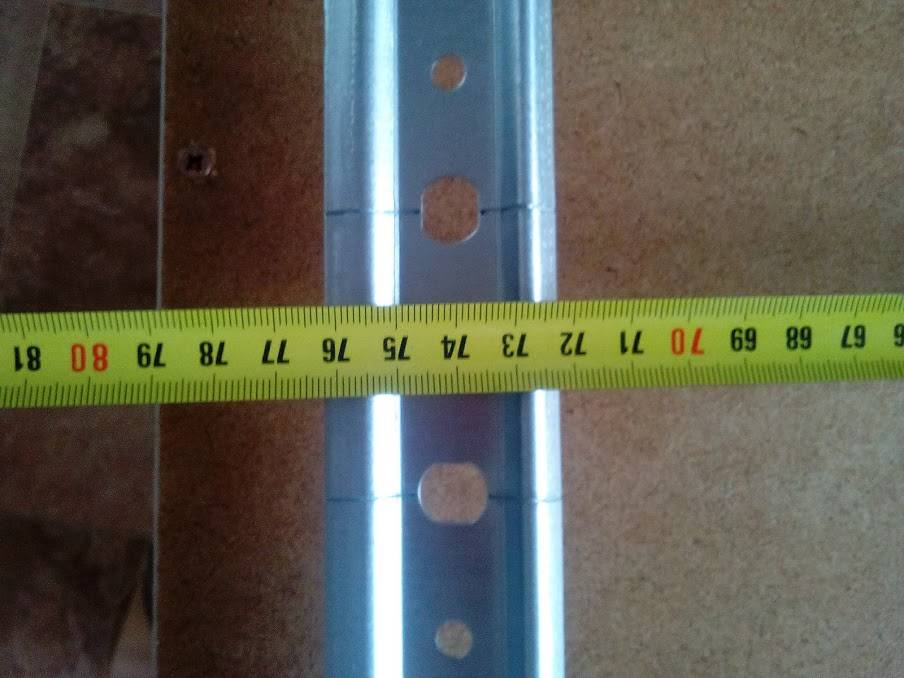 - Делим рейку на нужные отрезки. Стандартная длина в магазине — 2 м. Но по всей длине на ней есть насечки для разлома. Фиксируем рейку. Планка прикручивается саморезами под пластиковые дюбеля или фиксируется анкерами.