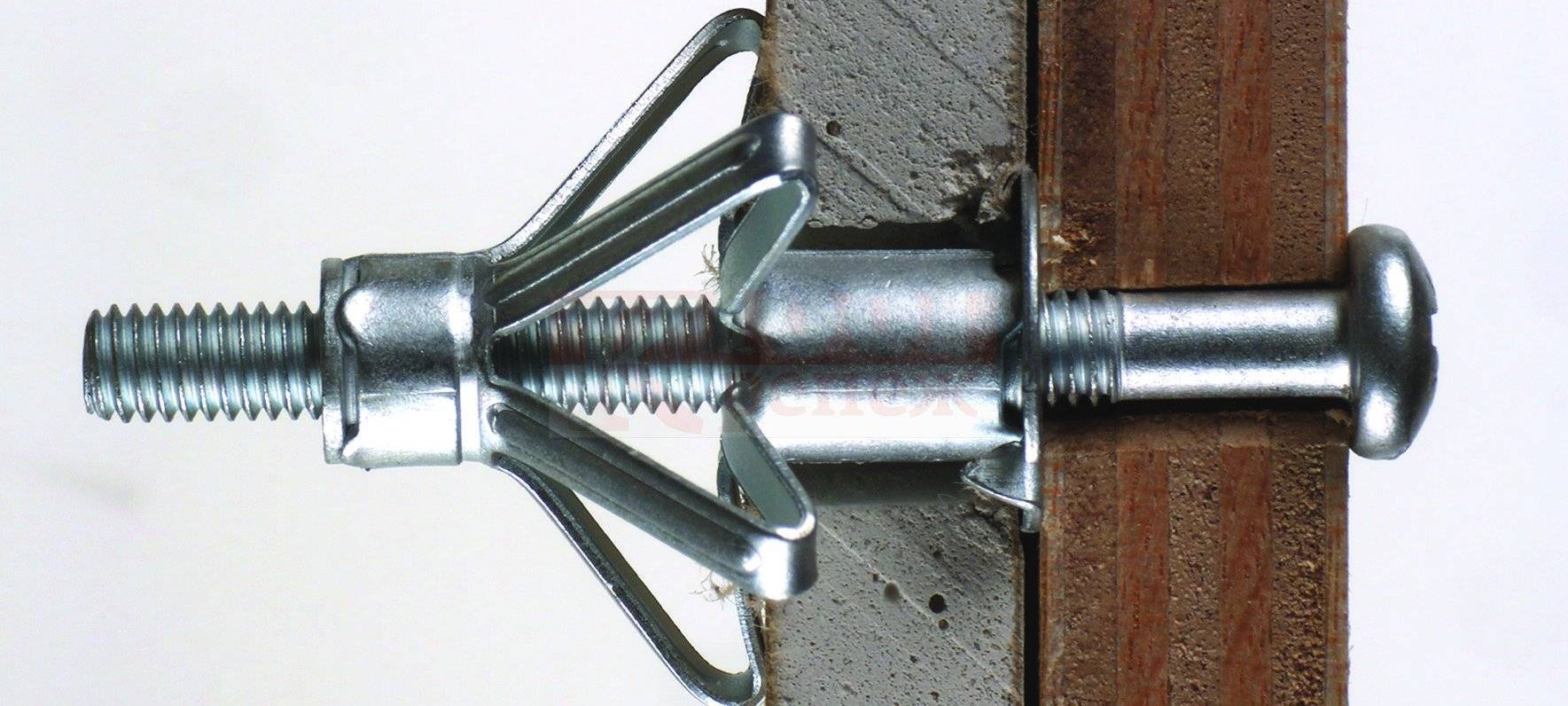 Дюбель “Молли” – просто устроен, продуктивно воспринимает нагрузки на вырывание до 35 кг с возможностью выполнять демонтаж. Крепление типа заклепки, нивелирующее риск прокручивания анкера.