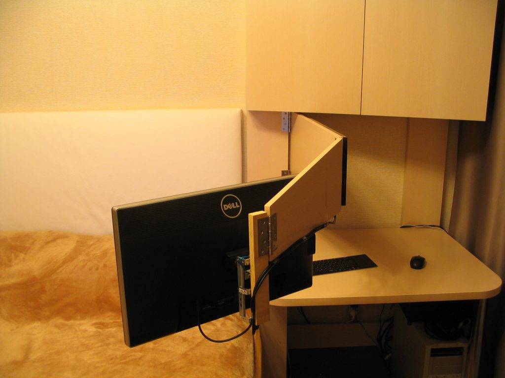 Чем тяжелее монитор, тем прочнее должно быть крепление. Конструкции могут отличаться в зависимости от ваших нужд. Можно сделать жёлоб, чтобы спрятать провода, создать какой-нибудь декоративный элемент, добавить что-то от себя.
