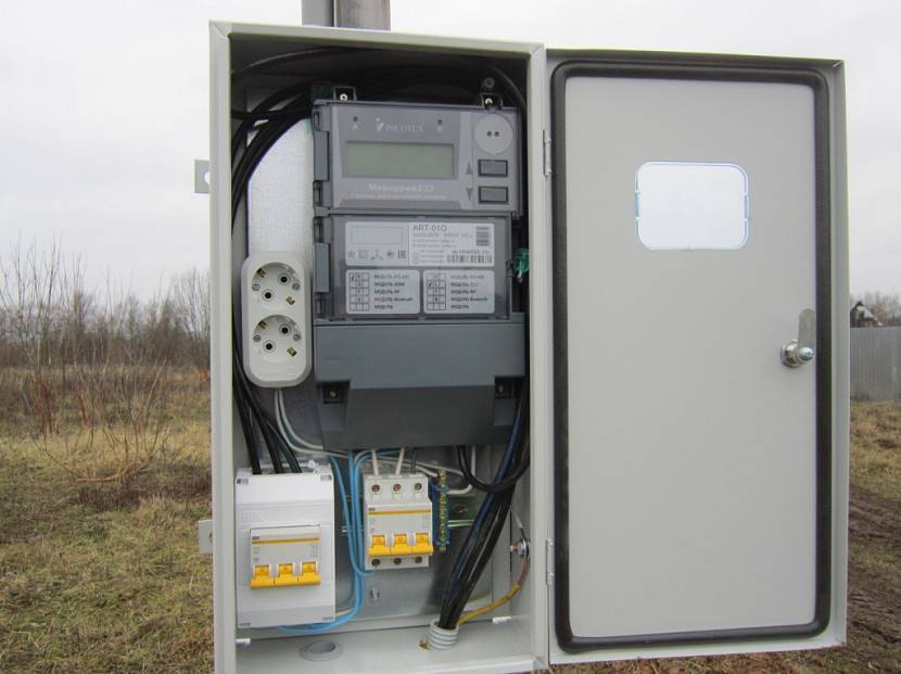 Монтирование трехфазного счетчика делают на улице. Его можно прикрепить к столбу или на стену дома. Включатели, с помощью которых поставляется энергия к точкам потребления необходимо поместить в другой коробке и находиться в помещении.