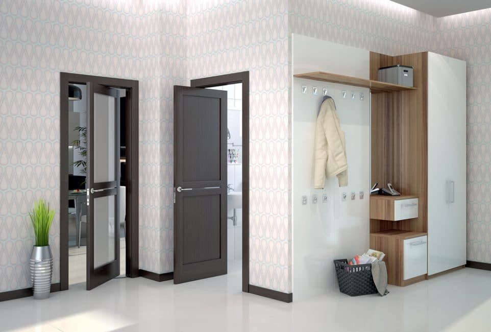 Если двери из разных помещений в квартире выходят в один коридор, то есть смысл купить их в одном цветет и стиле. Лучше в том стиле, на котором построен дизайн интерьера коридора или холла. Такой принцип позволит не нарушить целостность восприятия пространства.