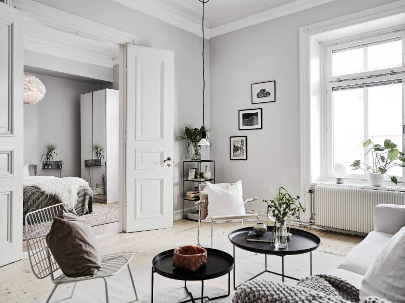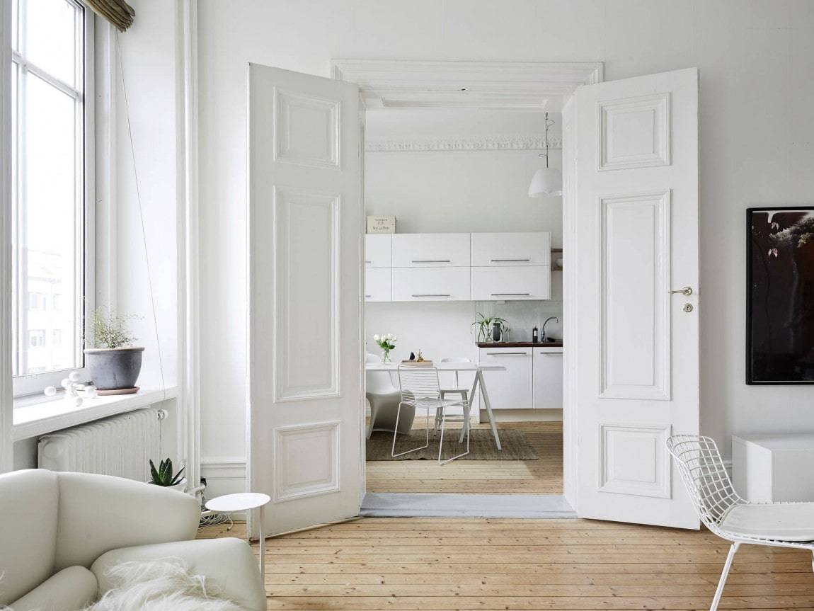 Скандинавский стиль выделяется наличием только необходимых предметов и высоким уровнем естественного освещения. Его отличают четкие линии и натуральность во всем. Особенно хорошо смотрятся белые двери, если у них есть металлические детали. Восприятие только повышается, когда конструкция остеклена. Также выигрышно выглядят зеркальные детали.