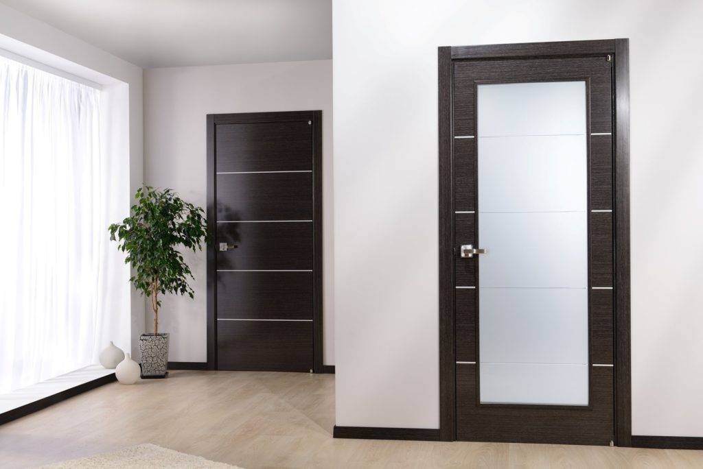 Современный стиль подчеркивают темные деревянные полотна из дерева венге с минимальной отделкой. Кроме этого, подойдут двери в минималистичном стиле: черные, белые, металлик.
