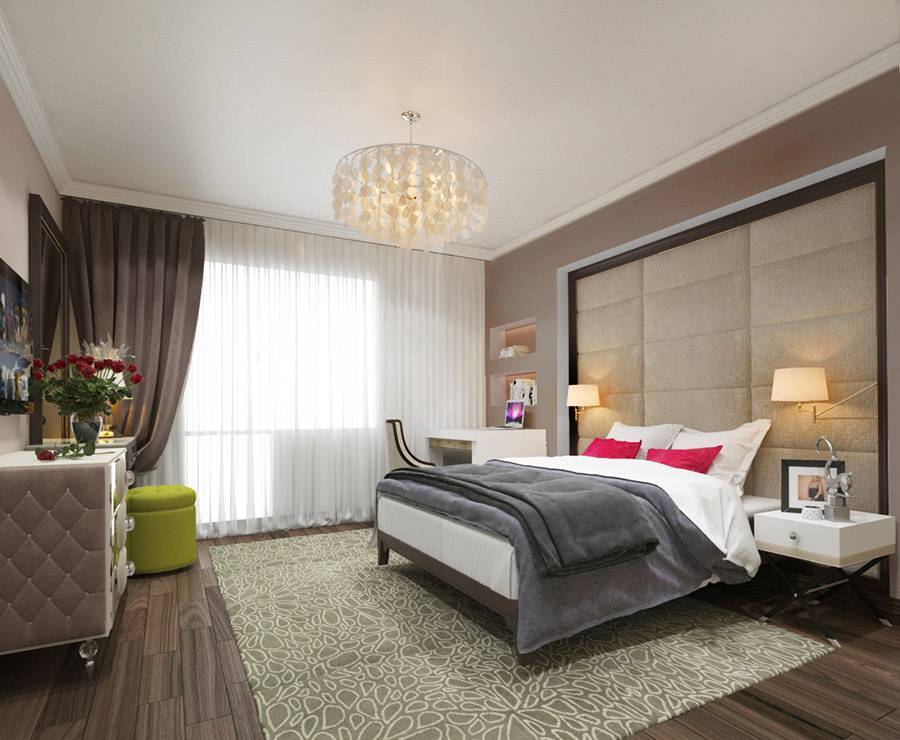 Не рекомендуется вешать над ложем громоздкие люстры. Они занимают много места, вызывают неосознанное беспокойство. Лучший вариант – натяжной потолок без видимых балок и с маленькими светильниками.