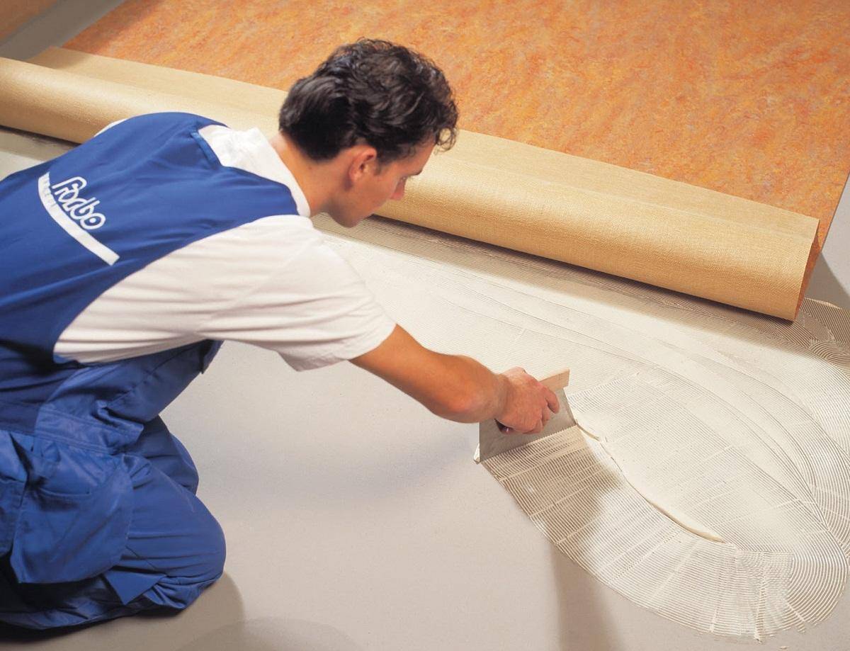 Так как видов линолеума достаточно много, то существуют и специальные клеи для применения в том, или ином случае. Чтобы настелить полотно на теплоизолирующей основе используется дисперсионный клей, который наносится на пол слоем толщиной около 0,7 мм. Для материалов на тканевой основе также используется дисперсионный клей, но толщина его слоя не должна превышать 0,5 мм.