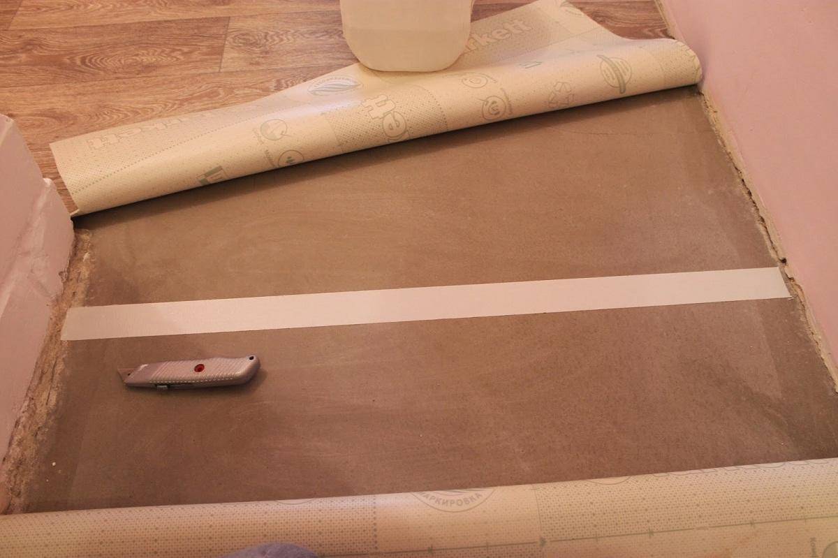 Так как плашки ступенчатого паркета имеют ширину меньше 10 см, под линолеум нужно постилать подложку. Такой материал не должен иметь большую толщину, чем напольное покрытие. В маленьких помещениях материал даже не закрепляют на клей, а только прижимают плинтусами. При таком способе он не должен «сползти» в сторону. Если поверхность большая, стоит сначала закрепить на клей подложку, а затем к ней приклеить напольное покрытие.
