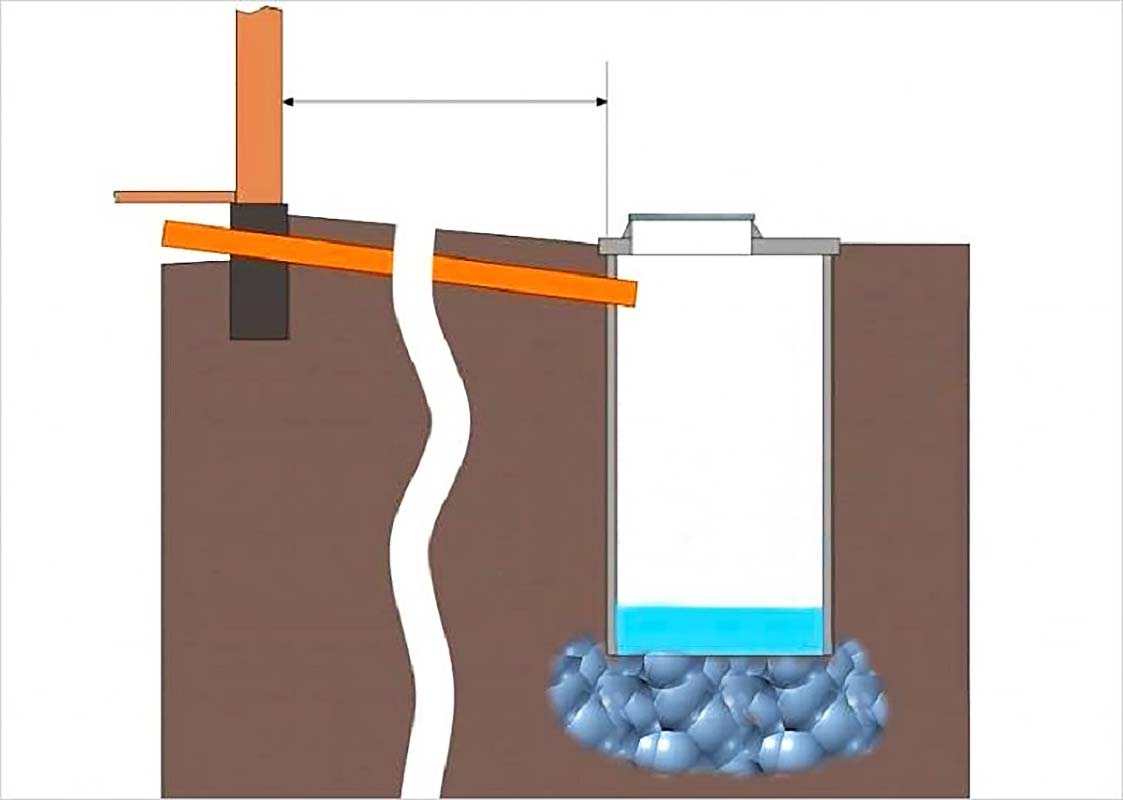Яму с открытым дном размещают на расстоянии не менее 5 м от фундамента строения и 20 м от источника водоснабжения. Глубина котлована зависит от уровня пролегания грунтовых вод, нижняя часть должна быть ниже УГВ не менее чем на 0,5 м.