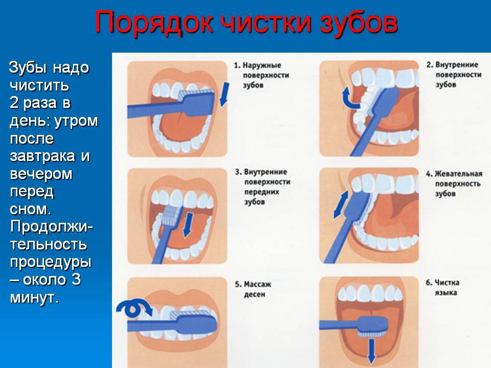 Чистить зубы нужно 2-3 минуты. Щетка должна двигаться в разных направлениях, охватывать как можно большую площадь эмали.